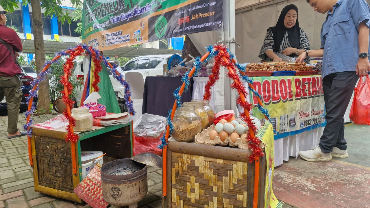 Sosok Arman Maulana, penjual kerak telur berusia 24 tahun, menjadi magnet yang menarik perhatian pengunjung dengan aroma dan cita rasa otentik Jakarta di Peringatan Hari Anti Korupsi Sedunia (Hakordia) 2025 yang berlangsung di Lapangan Komplek Pajak Kalibata, Jalan TMP Kalibata Nomor 19B, Jakarta Selatan (Jumat, 5/12).