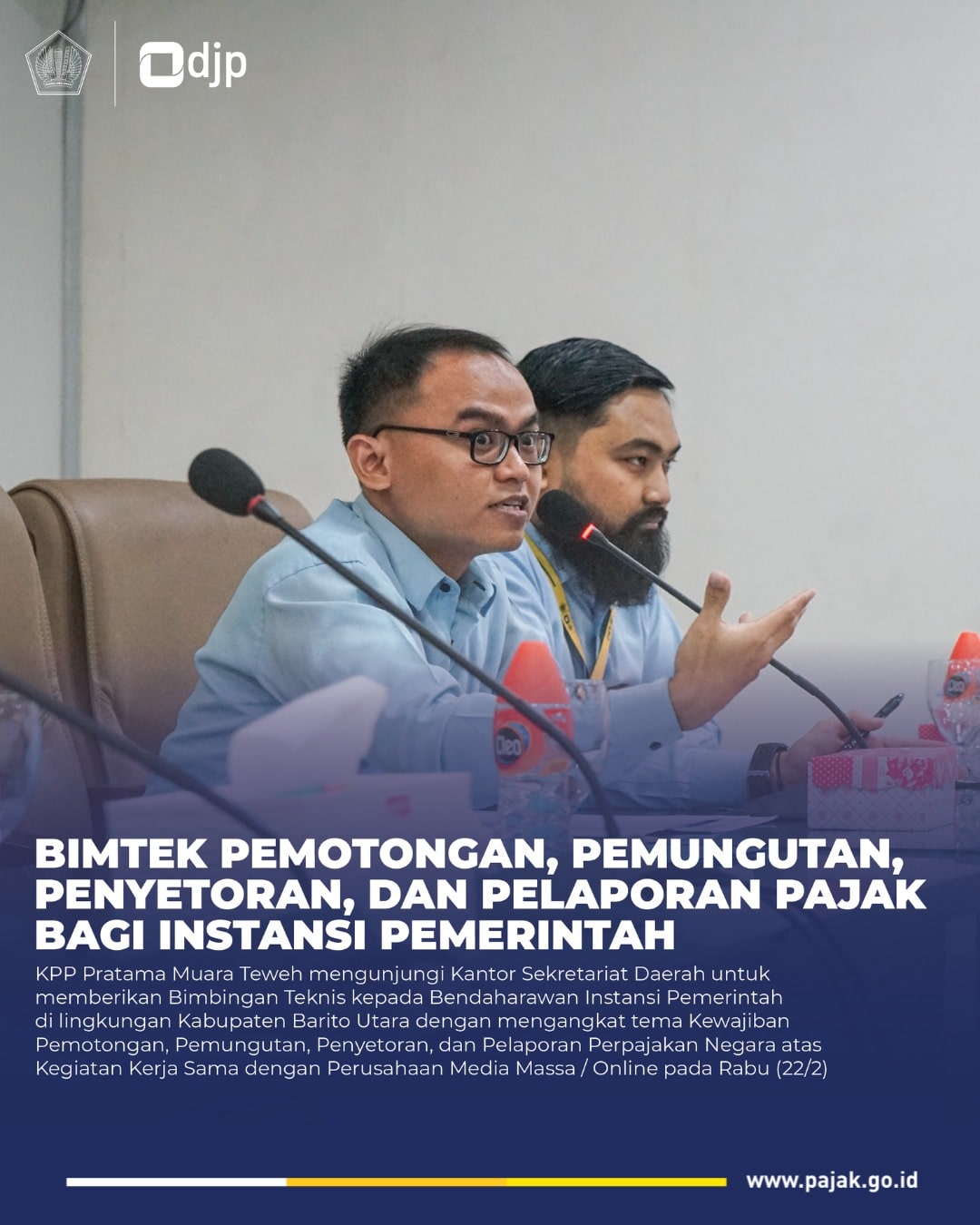 Memenuhi undangan dari Inspektorat Kabupaten Barito Utara, bertempat di Kantor Sekretariat Daerah Kabupaten Barito Utara, Kantor Pelayanan Pajak (KPP) Pratama Muara Teweh memberikan bimbingan teknis (bimtek) kepada Bendaharawan Instansi Pemerintah di lingkungan Pemerintah Daerah Kabupaten Barito Utara dengan mengangkat tema "Kewajiban Pemungutan, Penyetoran, dan Pelaporan Perpajakan Negara atas Kegiatan Kerja Sama dengan Perusahaan Media Massa/Online" (Rabu, 22/2).