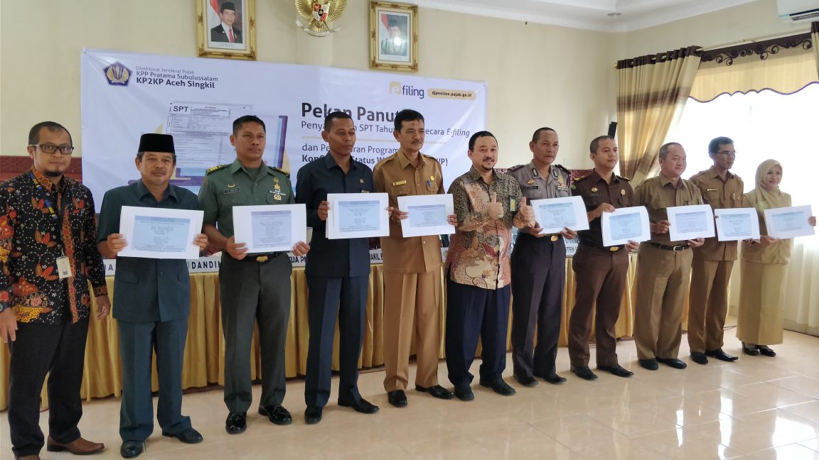 Sebagai bentuk pemenuhan kewajiban perpajakan yaitu melaporkan Surat Pemberitahuan (SPT) Tahunan, Bupati Aceh Singkil Dul Musrid beserta Forkopimda Aceh Singkil, yang terdiri dari Ketua DPRK, Dandim 0109 Aceh Singkil, Kapolres Aceh Singkil, Kepala Kejaksaan Tinggi Aceh Singkil, menyampaikan SPT Tahunan PPh Orang Pribadi tahun 2017 di Aula Kantor Bupati Aceh Singkil (Selasa, 20/3). Kegiatan tersebut dikemas dalam acara Pekan Panutan, Pemberian Penghargaan, dan Peluncuran KSWP yang dihadiri juga oleh pimpinan instansi vertikal, pimpinan BUMN, kepala dinas yang terkait dengan pajak, tokoh agama, dan masyarakat serta wajib pajak.