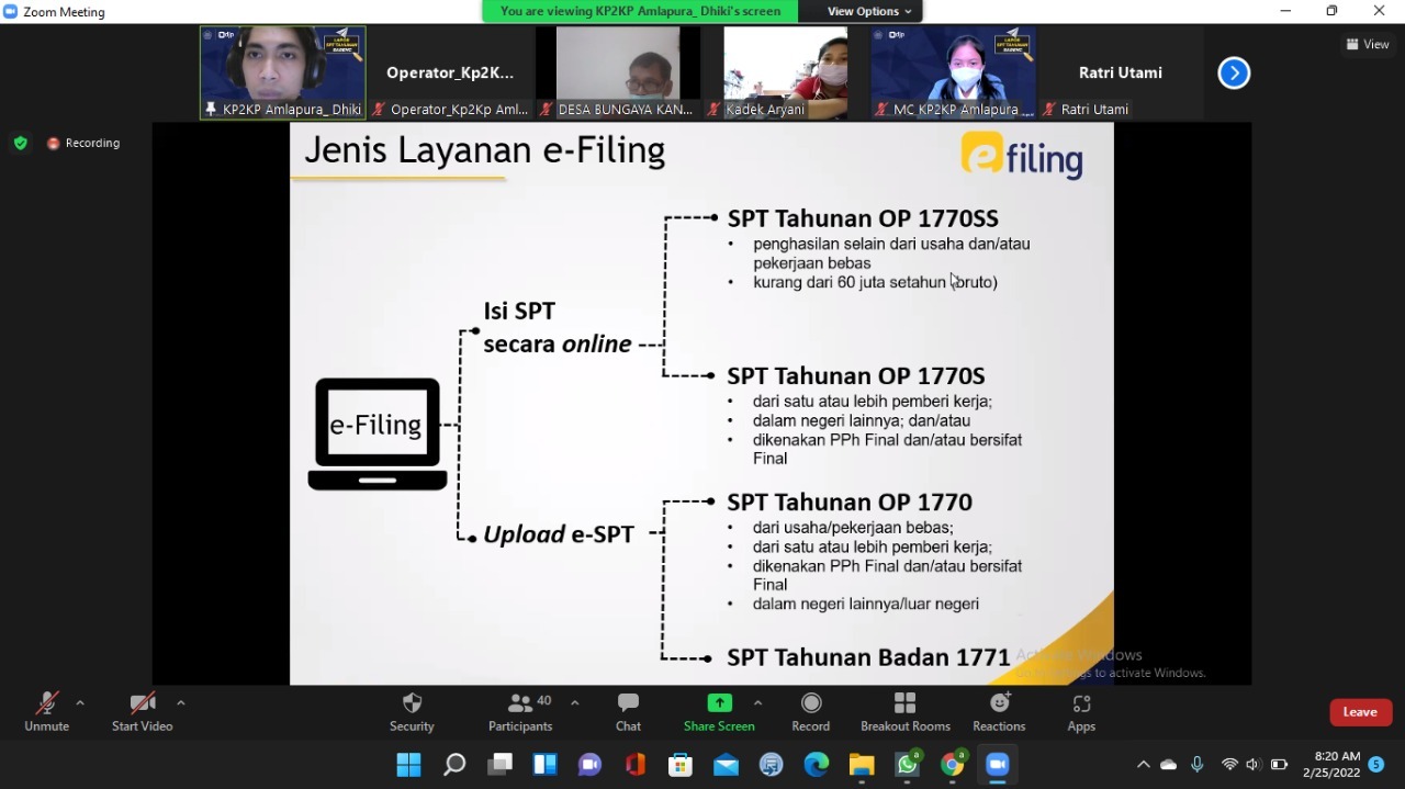 Kantor Pelayanan, Penyuluhan, dan Konsultasi Perpajakan (KP2KP) Amlapura mengadakan kelas pajak secara daring yang mengambil topik Pelaporan Surat Pemberitahuan (SPT) Tahunan melalui e-Filling di Kabupaten Karangasem, Bali (Kamis, 25/2). Kelas pajak ini mengundang perwakilan wajib pajak yang merupakan pegawai di unit desa di seluruh Kabupaten Karangasem. Sejumlah 47 peserta hadir secara virtual melalui aplikasi Zoom Meeting.