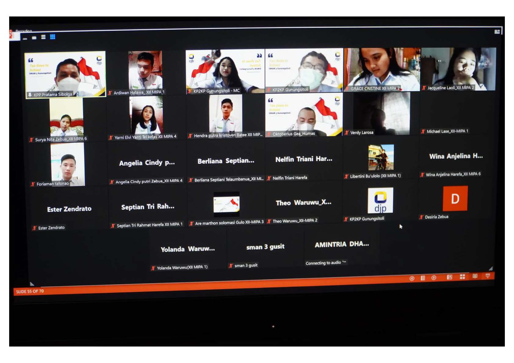 Kantor Penyuluhan, Pelayanan, dan Konsultasi Perpajakan (KP2KP) Gunungsitoli melaksanakan kegiatan edukasi perpajakan secara daring kepada siswa SMA Negeri 3 Gunungsitoli di Kota Gunungsitoli, Sumatera Utara (Rabu, 18/8).