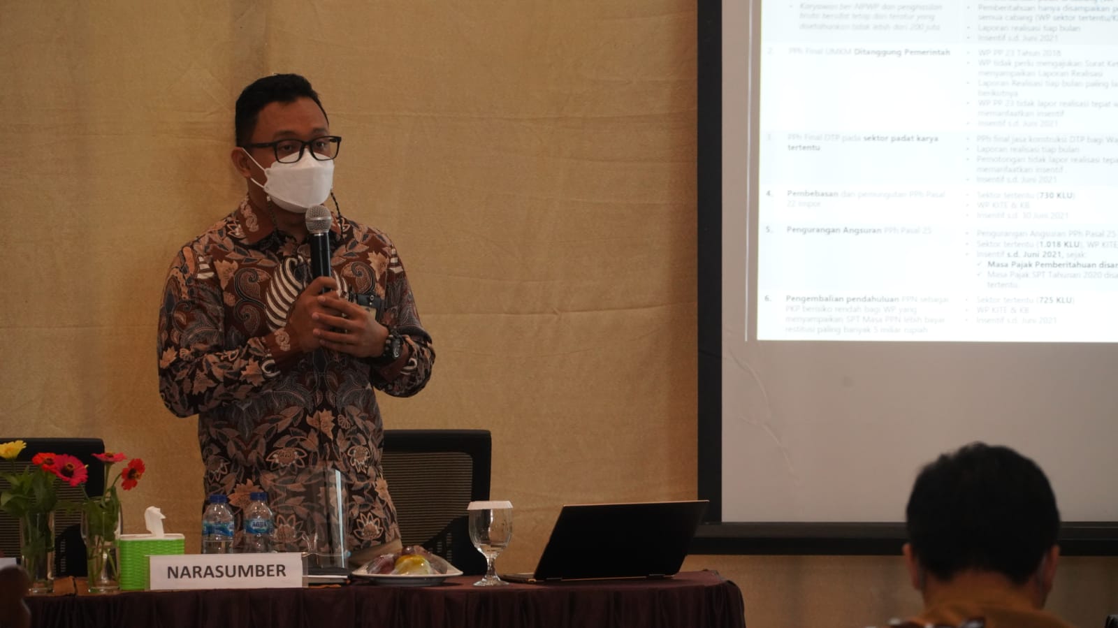 Kantor Pelayanan, Penyuluhan, Dan Konsultasi Perpajakan (KP2KP) Kepahiang bekerja sama dengan Dinas Penanaman Modal dan Pelayanan Terpadu Satu Pintu (DPMPTSP) Kepahiang melaksanakan edukasi kepada wajib pajak terkait insentif pajak (Selasa, 14/9). Kegiatan ini berlangsung di Aula Hotel Sandika, Kabupaten Kepahiang, secara tatap muka langsung dengan tetap menerapkan protokol kesehatan.