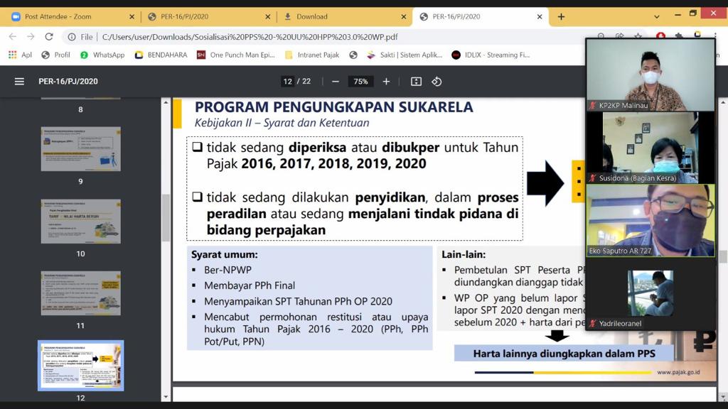 Kantor Pelayanan Penyuluhan dan Konsultasi Perpajakan (KP2KP) Malinau kembali melaksanakan kelas pajak secara daring Program Pengungkapan Sukarela melalui aplikasi zoom meeting yang diikuti oleh Wajib Pajak Orang Pribadi dan Badan Kabupaten Malinau (Jumat, 28/01).