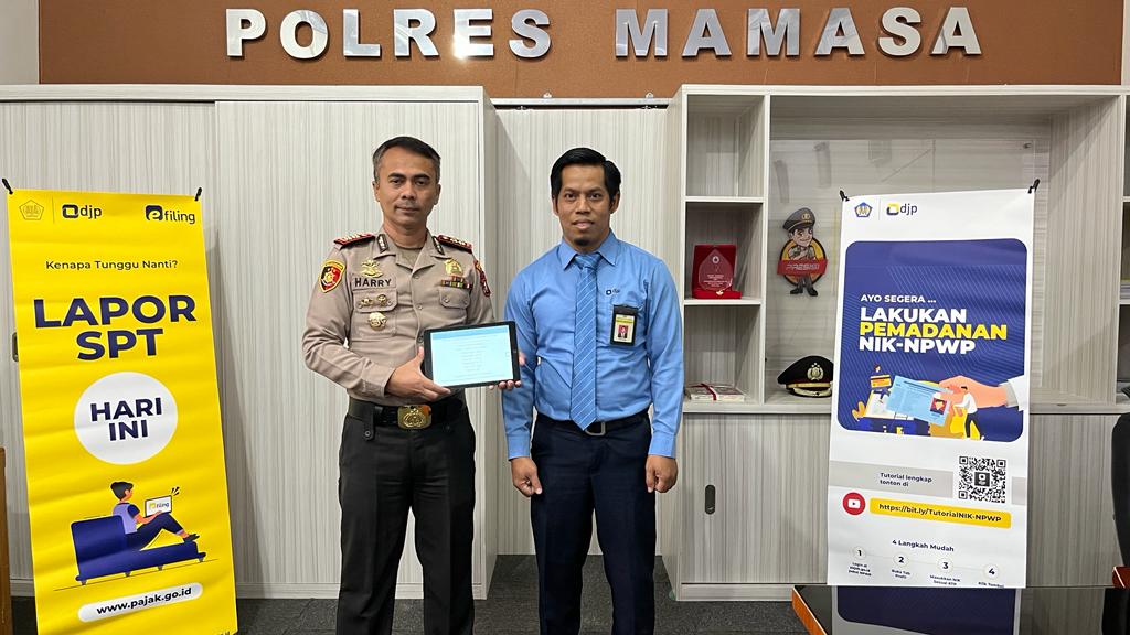 Kepala Kantor Pelayanan, Penyuluhan, dan Konsultasi Perpajakan (KP2KP) Mamasa Mustofah menemui Kapolres Mamasa AKBP Harry Andreas dalam rangka memberikan asistensi pemadanan Nomor Induk Kependudukan (NIK) menjadi Nomor Pokok Wajib Pajak (NPWP) dan pelaporan Surat Pemberitahuan (SPT) Tahunan bagi anggota polisi di Kepolisian Resor Mamasa (Rabu, 1/2).