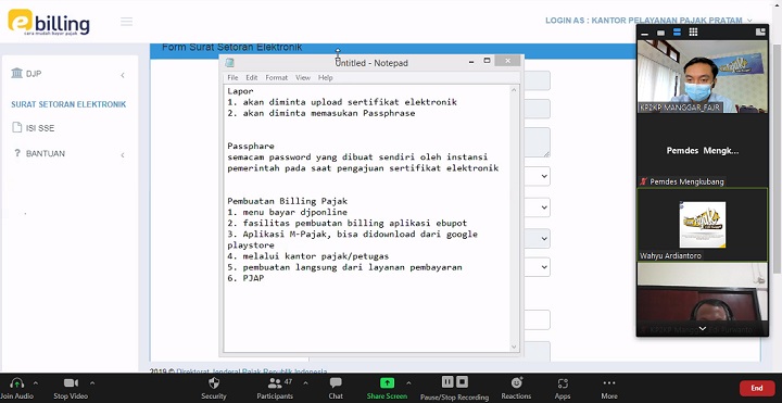 Kantor Pelayanan, Penyuluhan dan Konsultasi Perpajakan (KP2KP) Manggar mengundang para Bendaharawan Instansi Pemerintah di wilayah Belitung Timur untuk mengikuti pelatihan persiapan implementasi bukti pemotongan/pemungutan pajak dan Surat Pemberitahuan (SPT) Masa Unifikasi menggunakan aplikasi e-Bupot (Rabu, 22/09). Kegiatan ini diikuti oleh 50 peserta secara daring melalui aplikasi Zoom Meeting di Belitung Timur.