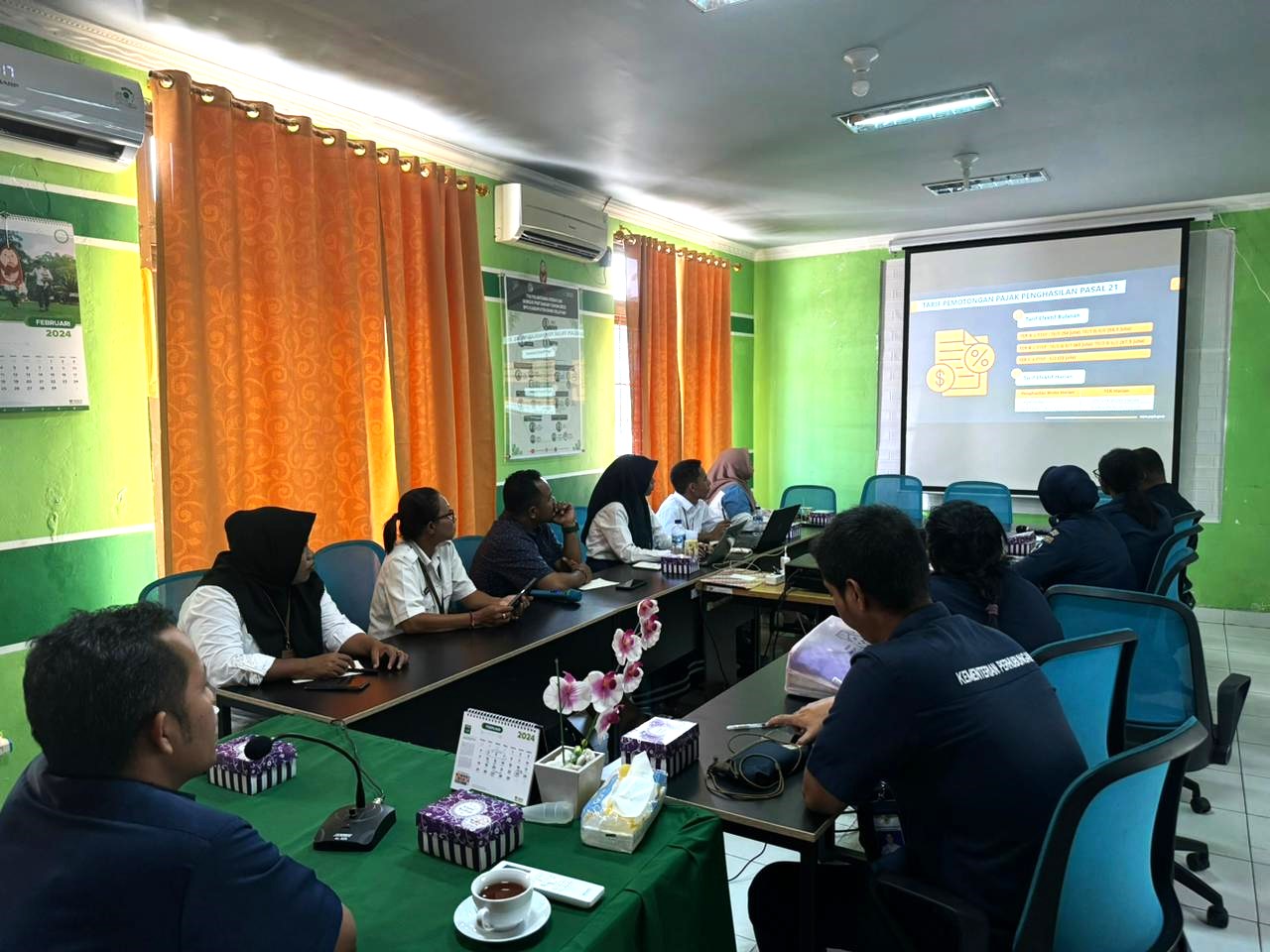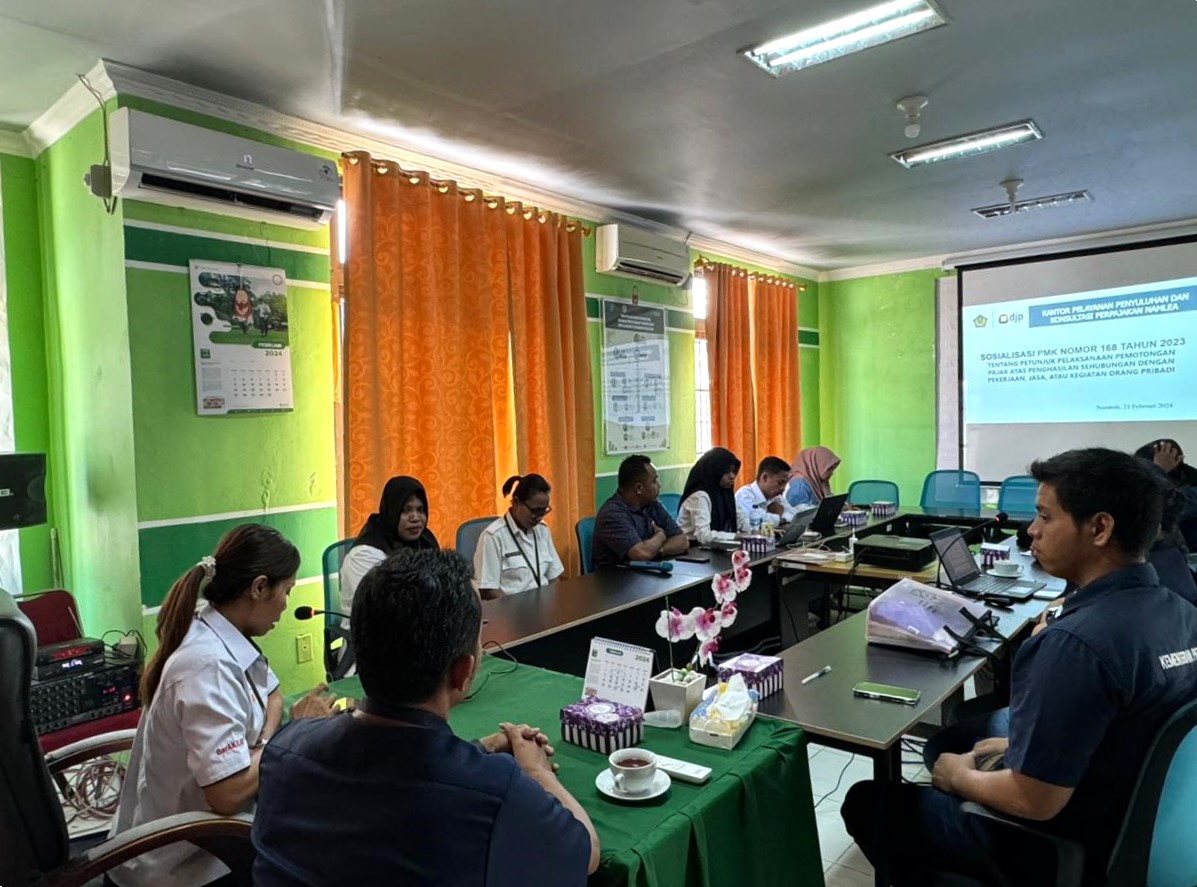 Tim Penyuluh Kantor Pelayanan, Penyuluhan, dan Konsultasi Perpajakan (KP2KP) Namlea melaksanakan Sosialisasi Peraturan Menteri Keuangan Nomor 168 Tahun 2023 tentang Petunjuk Pelaksanaan Pemotongan Pajak atas Penghasilan sehubungan dengan Pekerjaan, Jasa, atau Kegiatan Pribadi (Rabu, 21/2). Bertempat di Kantor Badan Pusat Statistik (BPS) Kabupaten Buru Selatan, kegiatan ini dihadiri oleh seluruh bendahara pengeluaran unit vertikal di Kabupaten Buru Selatan. Unit vertikal yang hadir antara lain, Kantor Unit Penyelenggara Pelabuhan Namrole, Kantor Bandar Udara Namrole, Kantor Kementerian Agama Buru Selatan, Kantor Badan Narkotika Nasional Buru Selatan, Kantor Komisi Pemilihan Umum Buru Selatan, dan Kantor Badan Pusat Statistik Buru Selatan, dengan jumlah peserta sebanyak 12 orang.
