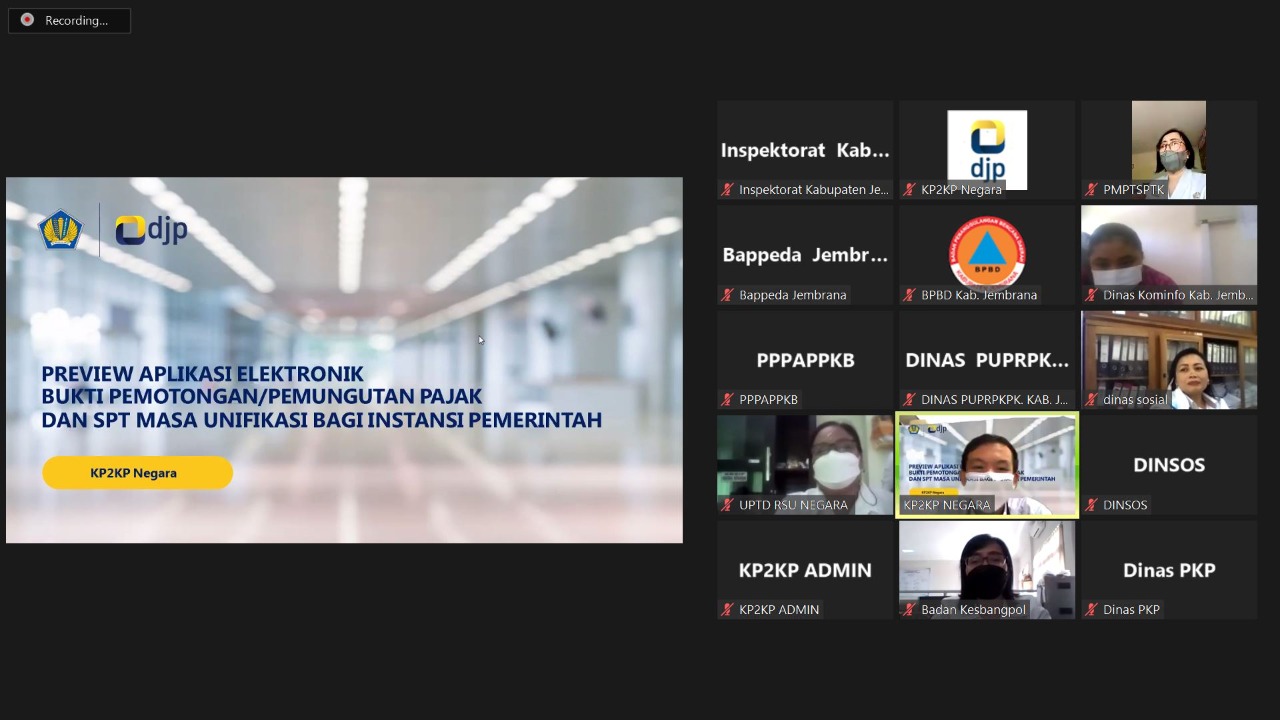 Kantor Pelayanan, Penyuluhan, dan Konsultasi Perpajakan (KP2KP) Negara menyelenggarakan edukasi perpajakan terkait penggunaan e-Bupot Unfikasi dan e-Bupot Pajak Penghasilan (PPh) 21/26 bendahara yang berada di lingkungan KP2KP Negara, Kabupaten Jembrana, Bali (Kamis, 30/9). Kegiatan yang diadakan selama tiga hari sejak 28 September 2021 bertempat di KP2KP Negara secara daring menggunakan aplikasi Zoom Meeting Cloud.