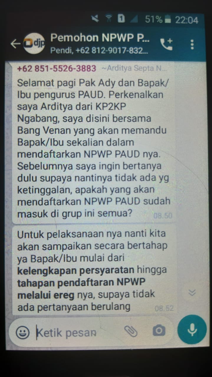 Kantor Pelayanan, Penyuluhan, dan Konsultasi Perpajakan (KP2KP) Ngabang mengadakan kelas pajak secara daring melalui Whatsapp (Jumat, 24/4). Kegiatan yang bertujuan untuk mengedukasi wajib pajak dalam pendaftaran NPWP PAUD ini diikuti oleh 30 orang peserta. Kegiatan edukasi dalam kelas pajak ini dibawakan oleh Tenaga Penyuluh KP2KP Ngabang Venansius Fajar Sinabutar dan Arditya Septa Nugraha.