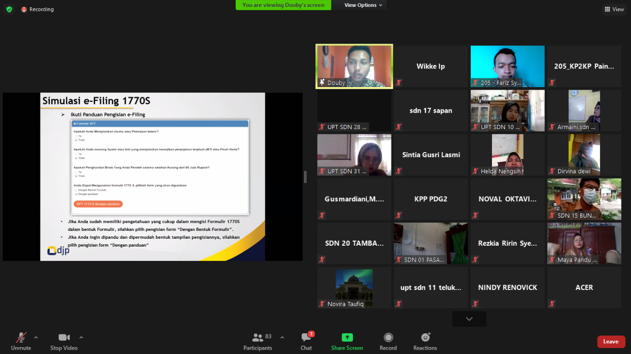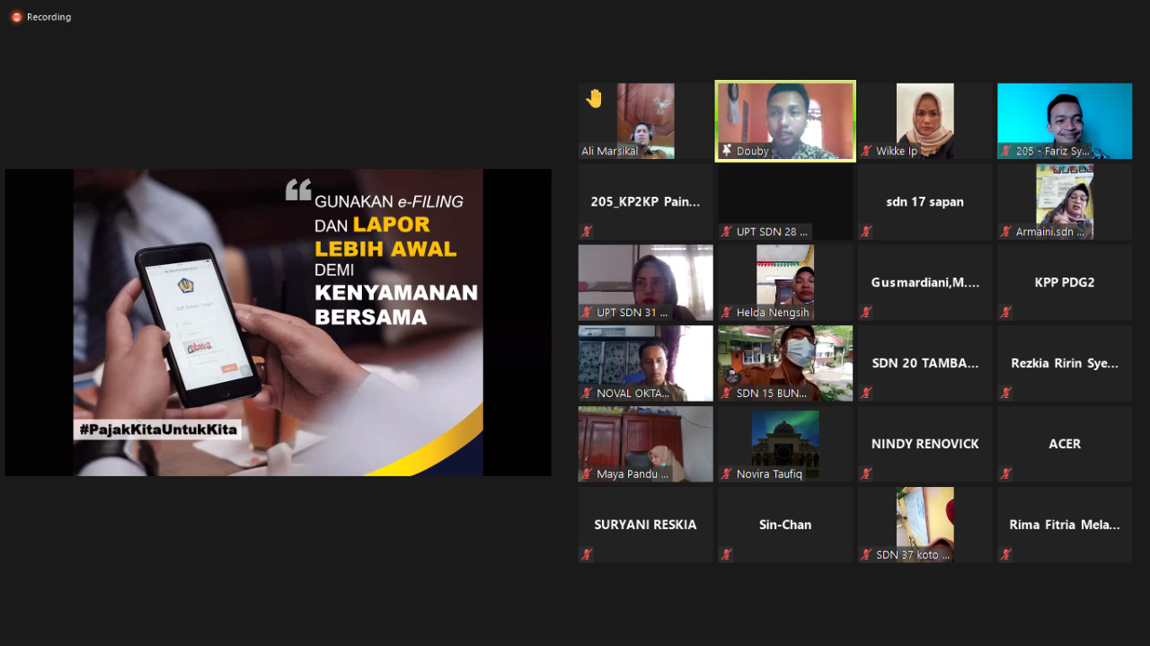 Kantor Penyuluhan, Pelayanan, dan Konsultasi Perpajakan (KP2KP) Painan mengadakan Bimbingan Teknis Tata Cara Pelaporan SPT Tahunan melalui e-Filling kepada para Aparatur Sipil Negara (ASN) di Kabupaten Pesisir Selatan secara virtual menggunakan aplikasi Zoom Meeting (Kamis, 18/2).