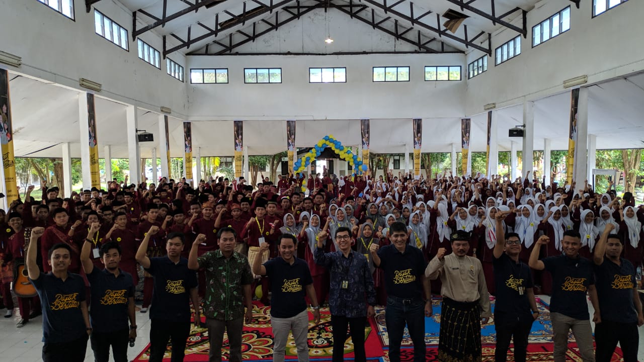 Kepala KP2KP Siak Sri Indrapura Jefrinaldi memaparkan rangkaian acara Pajak Bertutur di SMAN 1 Siak diawali dengan formasi kolossal mozaik dengan tema Pajak Bertutur yang diperagakan oleh seluruh siswa dan siswi SMAN 1 Siak.