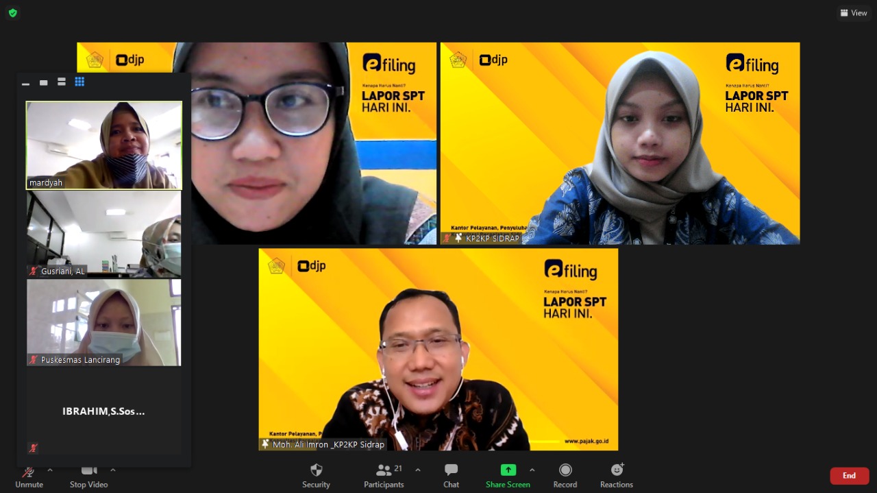 Kantor Pelayanan Penyuluhan dan Konsultasi Perpajakan (KP2KP) Sidrap memperluas target peserta sosialisasi pelaporan SPT Tahunan. ASN dari Dinas Kesehatan dan Puskesmas se-Kabupaten Sidrap turut diundang untuk mengikuti edukasi perpajakan pengisian SPT Tahunan Pajak Penghasilan dengan formulir 1770S melalui layanan e-Filing yang diadakan via daring melalui Zoom Meeting di Sidrap (Selasa, 2/3).
