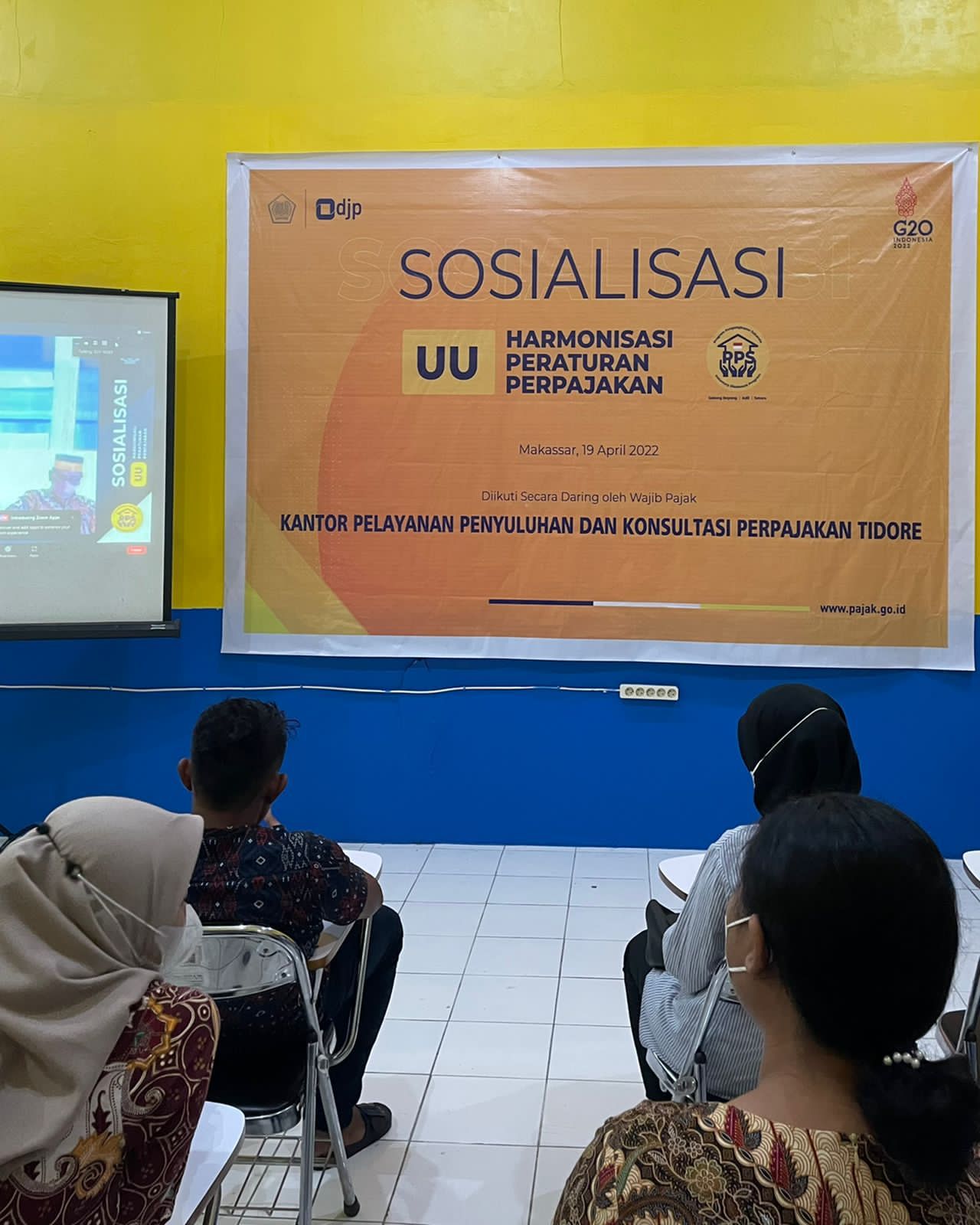 Adapun Kantor Pelayanan, Penyuluhan, dan Konsultasi Perpajakan (KP2KP) Tidore berkesempatan mengadakan sosialisasi Undang-Undang HPP secara daring yang disiarkan langsung oleh Direktorat Jenderal Pajak melalui zoom meeting. Kegiatan sosialisasi tersebut dimulai pada pukul 14.30 WIT sampai dengan pukul 17.30 WIT dan bertempat di aula KP2KP Tidore serta dilaksanakan dengan menerapkan protokol kesehatan. Kali ini KP2KP Tidore turut mengundang beberapa wajib pajak prominen di wilayah Kota Tidore Kepulauan untuk menghadiri sosialisasi Undang-Undang HPP.