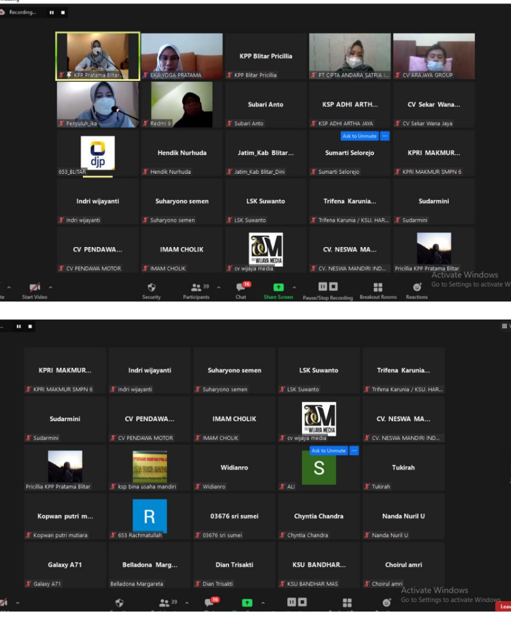 Kantor Pelayanan Pajak (KPP) Pratama Blitar mengadakan kelas pajak bagi wajib pajak terdampak pandemi Covid-19 di Blitar (Kamis,12/8). Dilaksanakan secara daring, kelas pajak ini diikuti oleh 47 Wajib Pajak Orang Pribadi dan Badan melalui media aplikasi Zoom Meeting dari ruang rapat KPP Pratam Blitar, Kota Blitar.