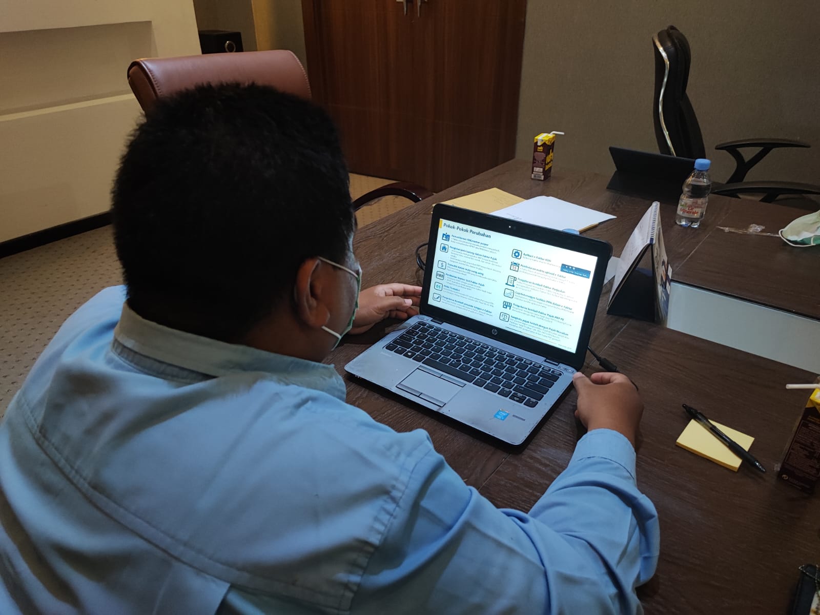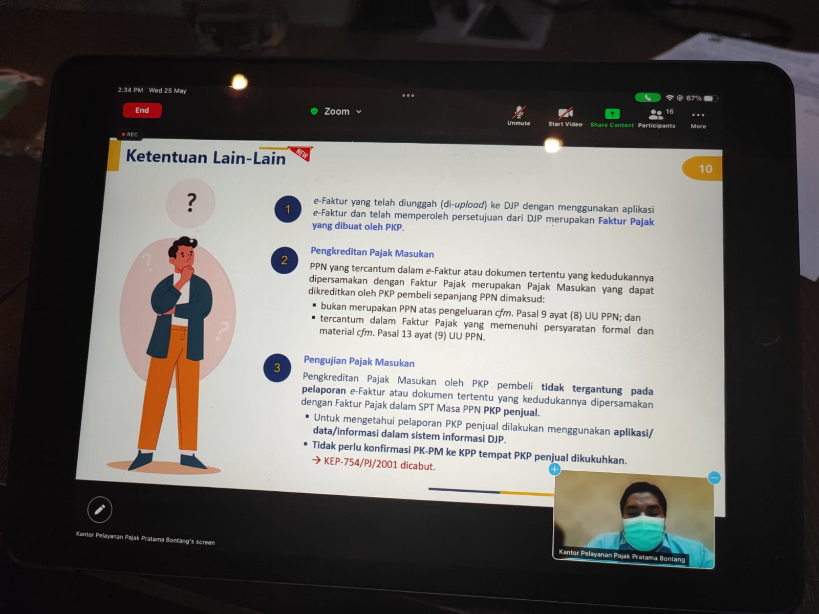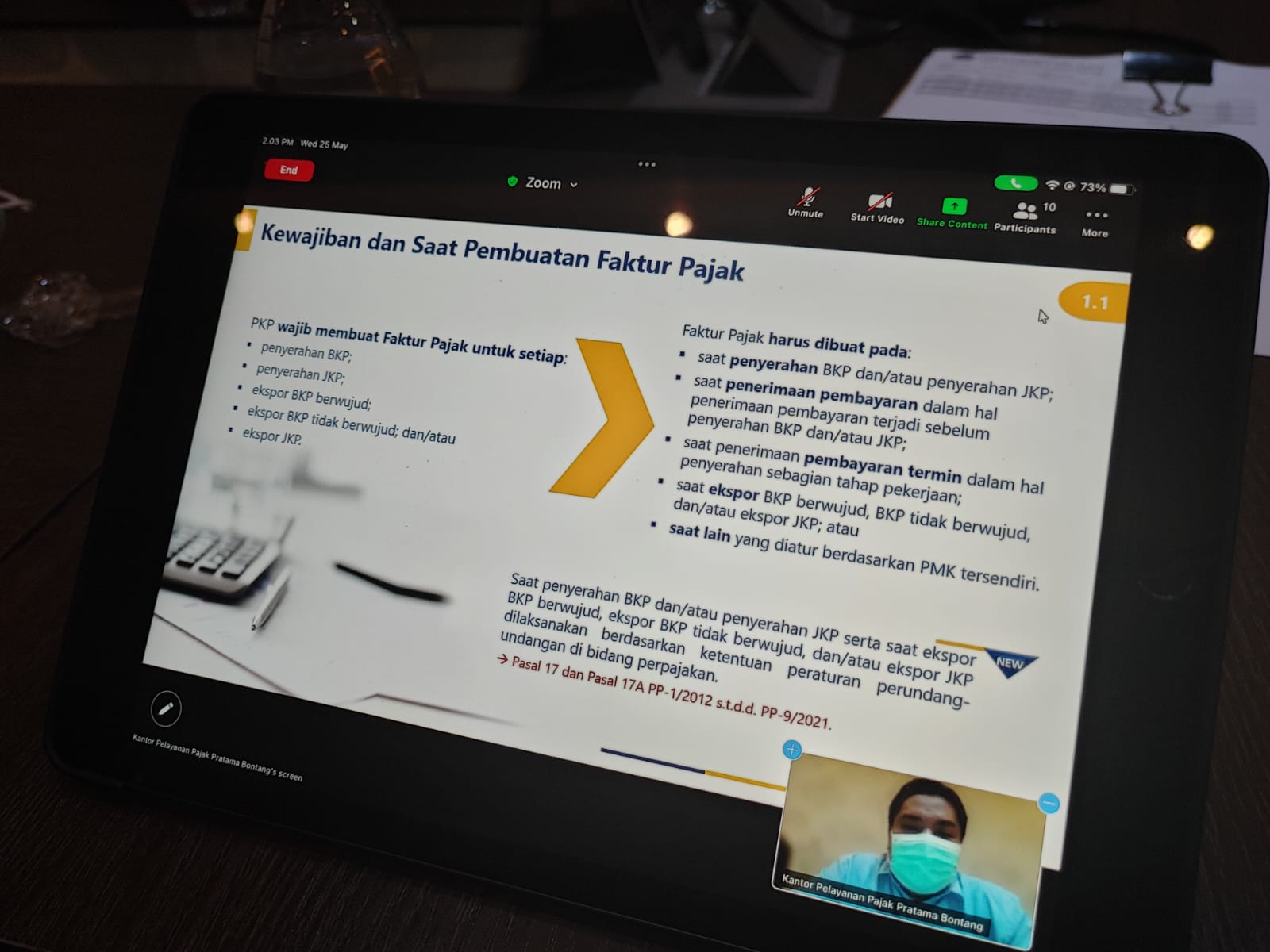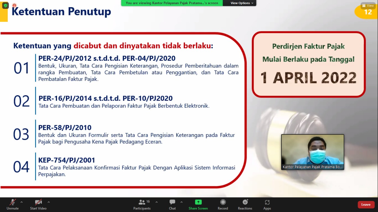 Kantor Pelayanan Pajak (KPP) Pratama Bontang melakukan Kelas Pajak Online terkait PER 03/PJ/2022 mengenai perubahan ketentuan Faktur Pajak, melalui Aplikasi Zoom Meeting di ruangan rapat KPP Pratama Bontang, Kota Bontang (Rabu, 25/5).