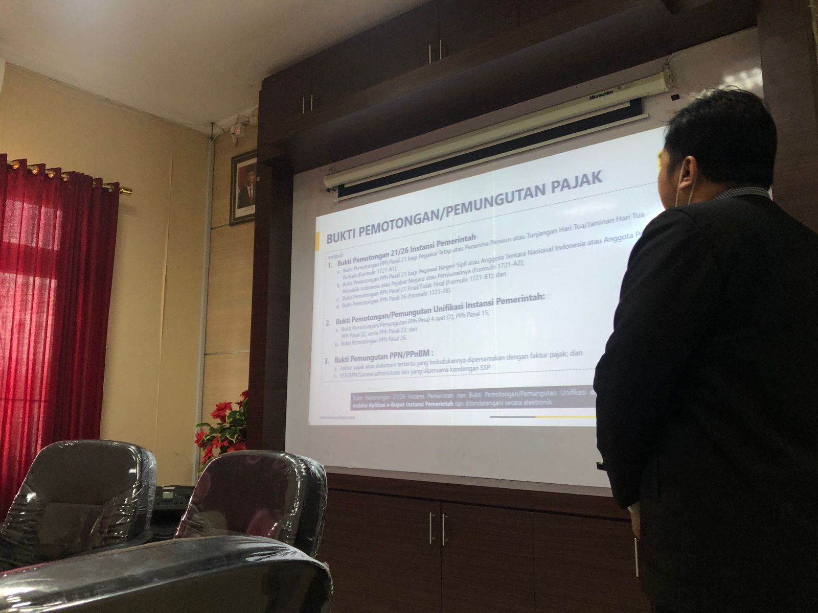 Asisten Penyuluh Pajak Budi Utomo melanjutkan dengan memberikan asistensi teknis penggunaan aplikasi e-Bupot Unifikasi Instansi Pemerintah dan pendaftaran subunit. Ia menjelaskan tata cara pembuatan bukti pemotongan dan/atau pemungutan pajak serta pelaporan SPT Masa melalui aplikasi ebupot Unifikasi Instansi Pemerintah.
