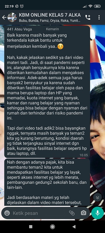 Tim Penyuluh Pajak Kantor Pelayanan Pajak (KPP) Pratama Bandung Cicadas menggelar Tax Goes To School secara daring melalui grup WhatsApp (WA) Kegiatan Belajar Mengajar (KBM) siswa-siswi SMP Plus Al-Kautsar, di Bandung (Senin, 19/7).