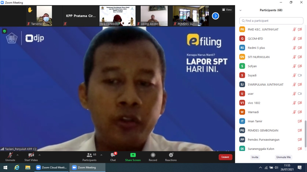 Kantor Pelayanan Pajak (KPP) Pratama Cirebon Dua melakukan kegiatan penyuluhan Materi Perpajakan terkait penyaluran Dana Desa pada kegiatan Forum Group Discussion (FGD) Kantor Pelayanan Perbendaharaan Negara (KPPN) Cirebon bersama Bendahara Desa Wilayah Cirebon dan Indramayu secara daring melalui Aplikasi Zoom Cloud Meeting di Ruang Sinau KPP Pratama Cirebon Dua (Senin, 26/7).