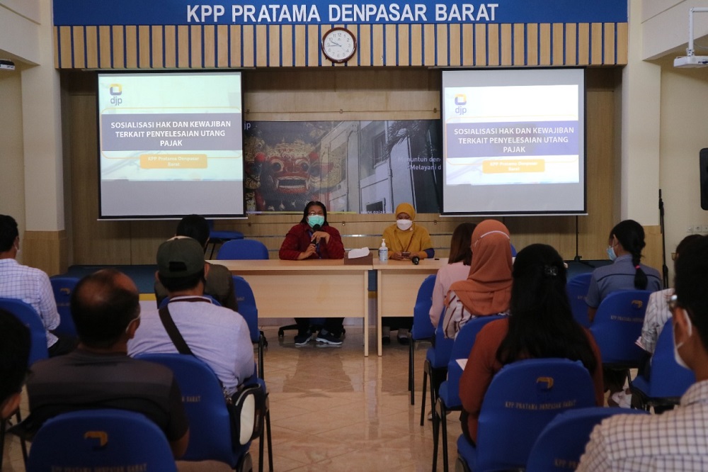 Kantor Pelayanan Pajak (KPP) Pratama Denpasar Barat melaksanakan acara Sosialisasi Hak dan Kewajiban Terkait Penyelesaian Utang Pajak dengan tujuan memberikan pemahaman terkait penyelesaian utang pajak dan meningkatkan pencairan saldo piutang pajak yang bertempat di aula KPP Pratama Denpasar Barat (Selasa, 25/1).