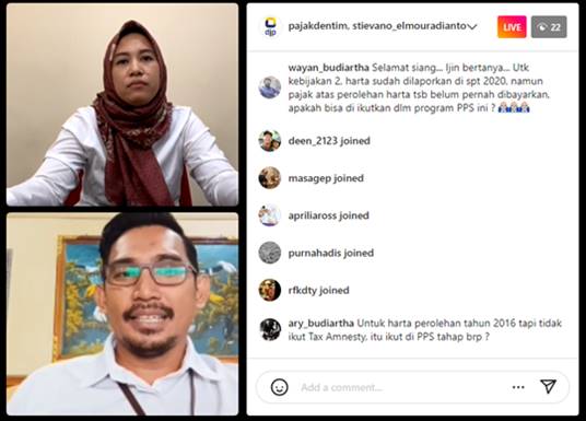 Menjelang ujung batas waktu pemanfaatan Program Pengungkapan Sukarela (PPS) pada akhir bulan Juni 2022, Kantor Pelayanan Pajak (KPP) Denpasar Timur semakin gencar melakukan kegiatan sosialisasi. Salah satu kegiatan sosialisasi PPS dilaksanakan melalui siaran langsung di Instagram dan diadakan di ruang rapat KPP Pratama Denpasar Timur, Denpasar, Bali (Senin, 20/6).