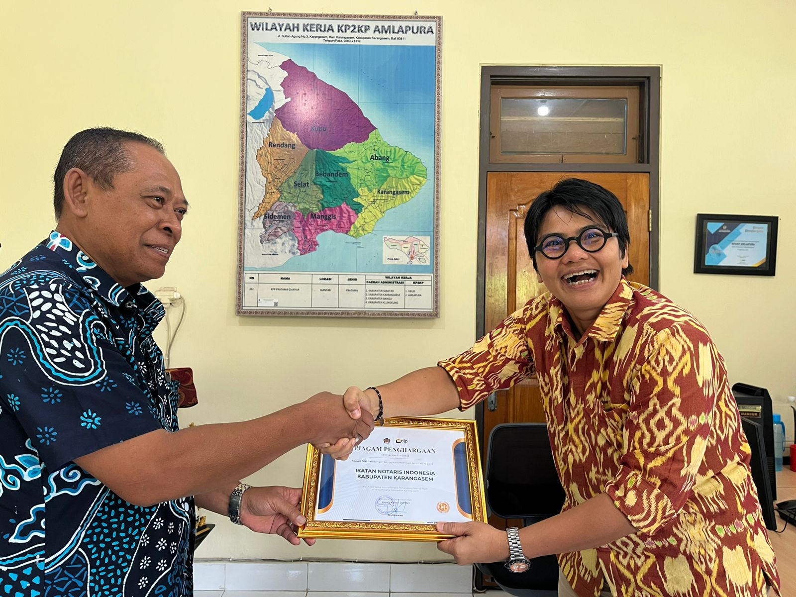 Kantor Pelayanan Pajak (KPP) Pratama Gianyar menyerahkan apresiasi dan penghargaan dari Kantor Wilayah Direktorat Jenderal Pajak Bali kepada Majelis Pengawas Daerah (MPD) Notaris Kabupaten Karangasem dan Ikatan Notaris Indonesia (INI) Kabupaten Karangasem.