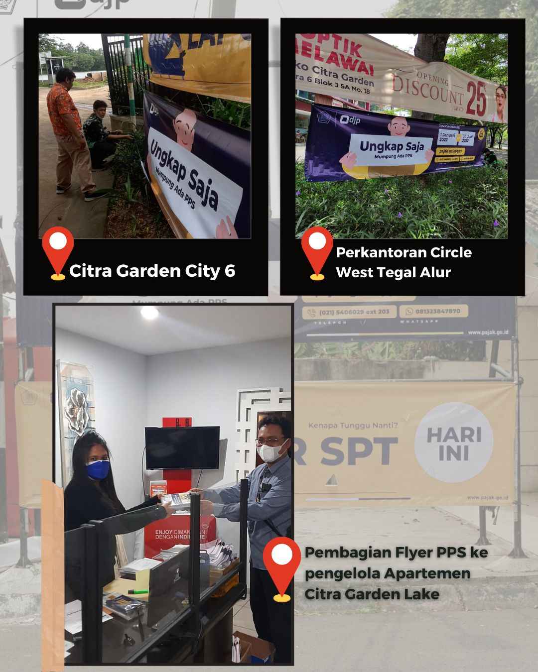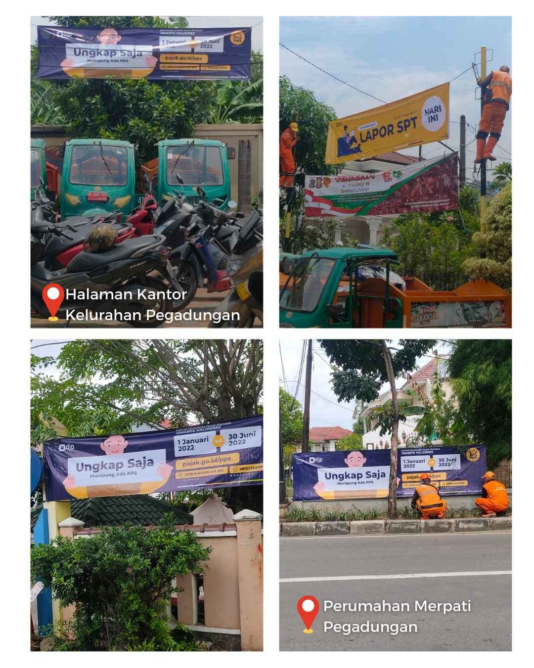 Kegiatan pemasangan spanduk imbauan SPT dan sosialisasi PPS ini tidak hanya melibatkan pegawai KPP Pratama Jakarta Kalideres namun juga Pekerja Penanganan Sarana dan Prasarana Umum (PPSU) di tingkat kelurahan.