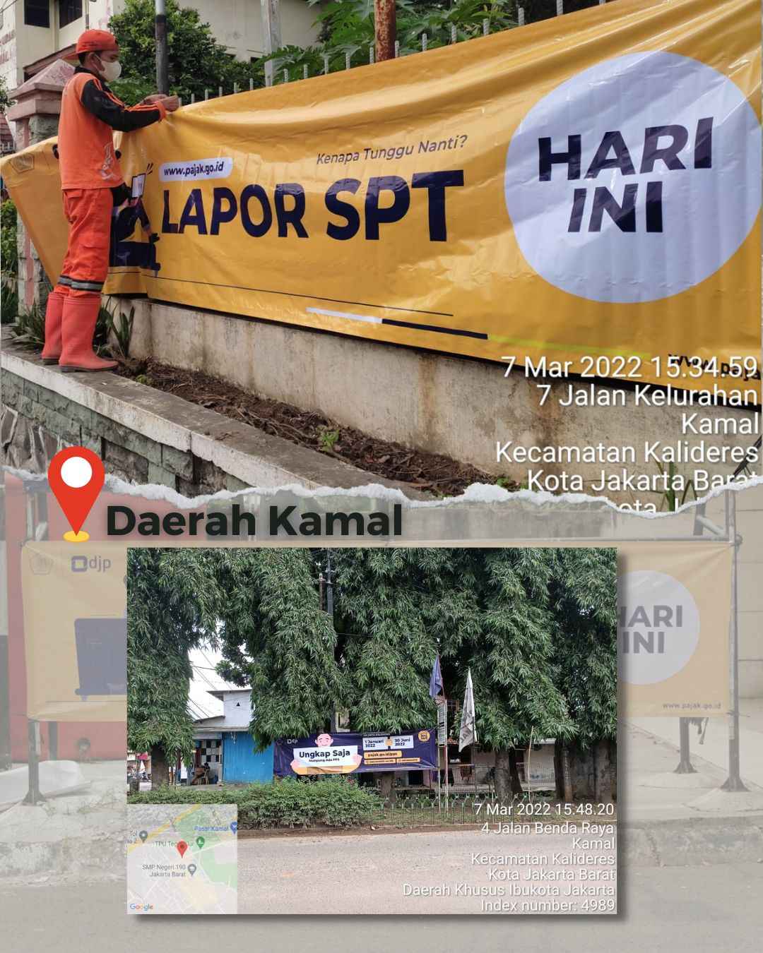 Pemasangan spanduk ini terlebih dahulu berkoordinasi dengan pihak pemerintah daerah yaitu kelurahan di Kecamatan Kalideres yakni Kelurahan Kalideres, Kelurahan Semanan, Kelurahan Pegadungan, Kelurahan Tegal Alur, dan Kelurahan Kamal. Pihak kelurahan mendukung penuh aksi kegiatan imbauan dan sosialisasi dari pihak KPP Pratama Jakarta Kalideres dengan mengizinkan dan mengarahkan ke beberapa lokasi pemasangan spanduk yang mudah dibaca oleh masyarakat sekitar maupun pengendara yang melewati lokasi tersebut.