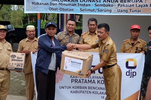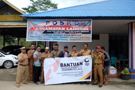 Kantor Pelayanan Pajak (KPP) Pratama Kolaka menyerahkan bantuan untuk korban banjir Kabupaten Kolaka Timur di Kecamatan Ladongi (Selasa, 18/6). Bantuan berupa sembako, air mineral, pakaian, popok bayi, dan sarung serta selimut berasal dari sumbangsih seluruh pegawai KPP Pratama Kolaka. Bantuan diserahkan oleh La Aibu sebagai perwakilan pegawai KPP Pratama Kolaka dan diterima langsung oleh Camat Ladongi, Saeho.
