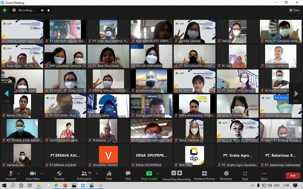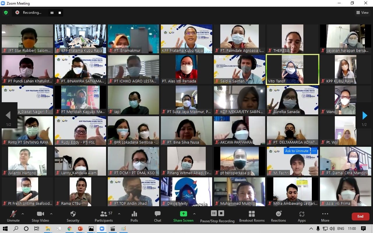 KPP Pratama Kubu Raya menyelenggarakan Sosialisasi Pembangunan Zona Integritas dan Pemberitahuan untuk Menjadi Responden Survei kepada wajib pajak di Wilayah Kab. Kubu Raya dan Kab. Mempawah (Rabu, 1/9). Kegiatan ini dilaksanakan secara daring melalui media Zoom dan dihadiri oleh 55 wajib pPajak di Wilayah Kerja KPP Pratama Kubu Raya.