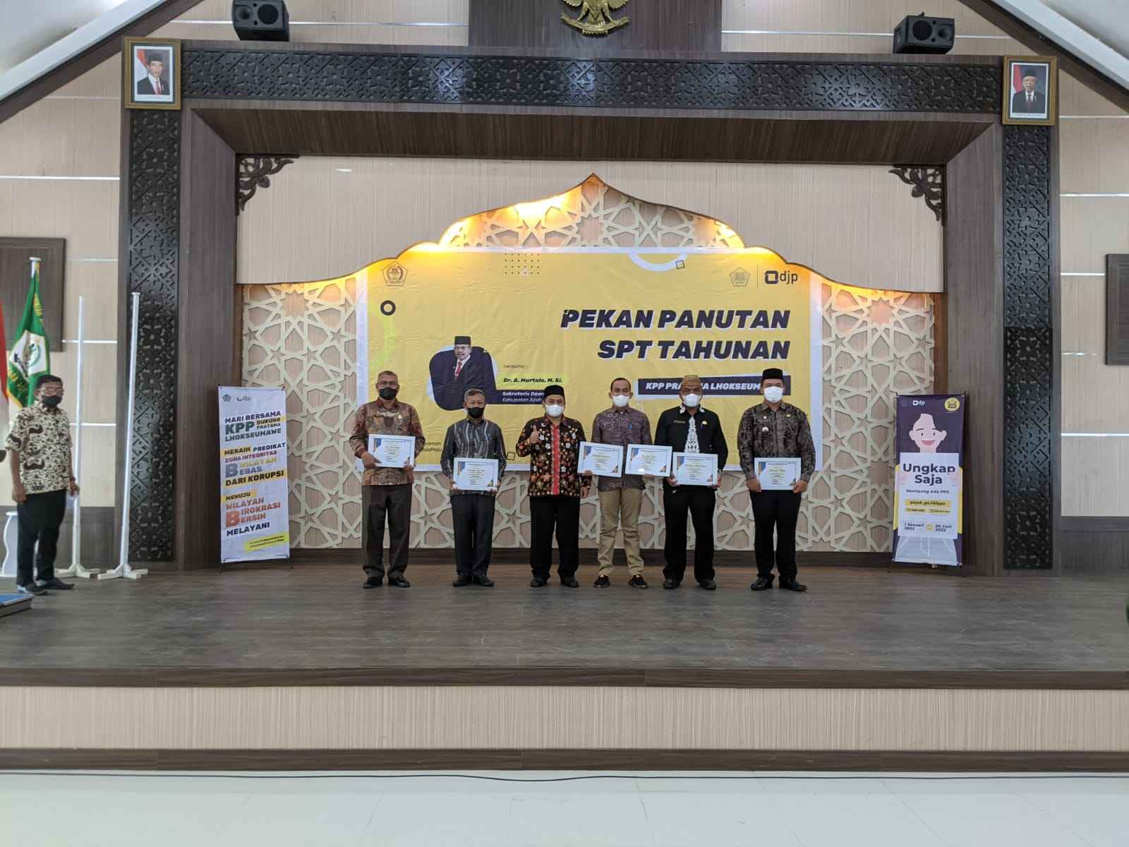 Pekan Panutan Pajak 2022 ditutup oleh penyerahan plakat penghargaan pelaporan SPT Tahunan oleh Muhammad Taufiq Hidayatulloh Al Mahdy kepada Bupati Aceh Utara H Muhammad Thaib dan Dr A Murtala, MSi.