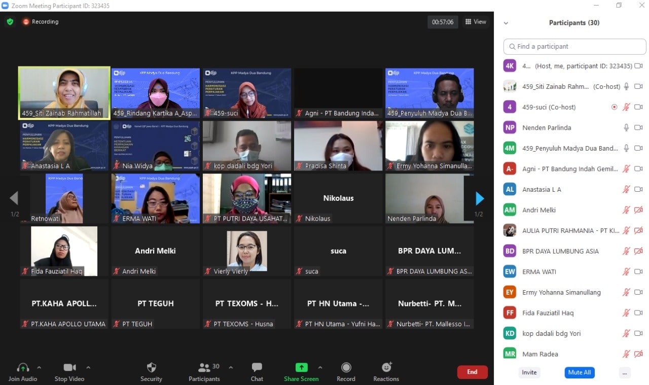 Tim Penyuluh Kantor Pelayanan Pajak (KPP) Madya Dua Bandung menyelenggarakan kegiatan penyuluhan dengan tema bahasan pokok-pokok Undang-Undang Harmonisasi Peraturan Perpajakan (UU HPP) secara daring di Ruang Rapat KPP Madya Dua Bandung, Kota Bandung (Kamis, 18/11).