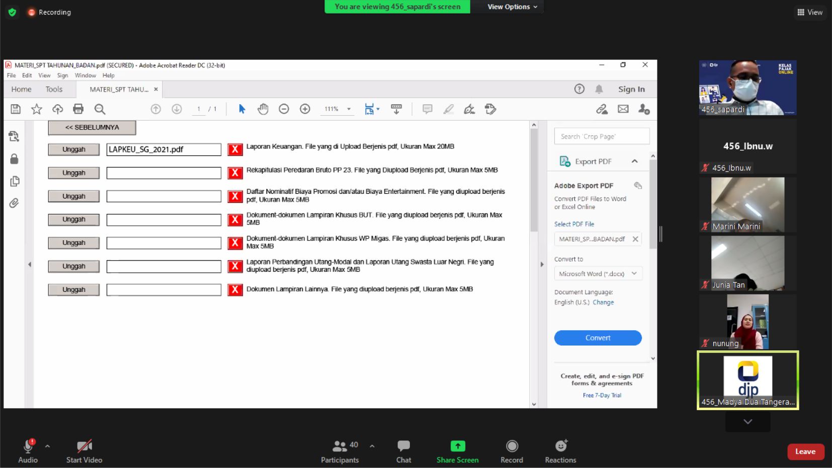 Kantor Pelayanan Pajak (KPP) Madya Dua Tangerang mengadakan Sosialisasi Tata Cara Pelaporan Surat Pemberitahuan (SPT) Tahunan Badan secara daring yang diikuti oleh 45 pengurus wajib pajak badan melalui aplikasi Zoom Meeting di ruang penyuluhan KPP Madya Dua Tangerang, Kabupaten Tangerang (Kamis, 7/4).