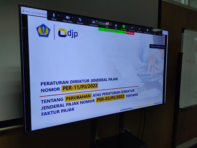 Kantor Pelayanan Pajak (KPP) Madya Jakarta Timur menyelenggarakan Kelas Pajak online terkait Peraturan Direktur Jenderal Pajak nomor PER-11/PJ/2022 tentang Perubahan atas Peraturan Direktur Jenderal Pajak nomor PER-03/PJ/2022 tentang Faktur Pajak. Kelas Pajak yang diselenggarakan melalui Zoom Meeting ini, diikuti oleh 100 (seratus) wajib pajak terdaftar. Kelas Pajak ini berlangsung pada pukul 14.30 WIB di Ruang Edukasi Lantai 15 Gedung Pajak Madya (Senin, 29/8).