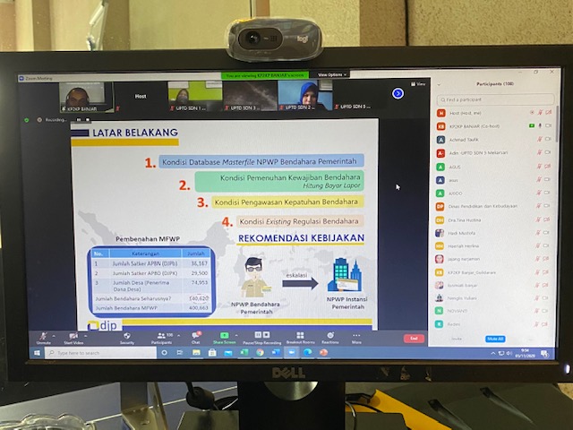 KPP Mikro Banjar menggelar Sosialisasi NPWP Instansi Pemerintah secara daring di Banjar (Kamis, 5/11). Acara ini diikuti 110 Bendahara Sekolah Dasar (SD) dan Sekolah Menengah Pertama (SMP) di lingkungan Dinas Pendidikan dan Kebudayaan Kota Banjar.
