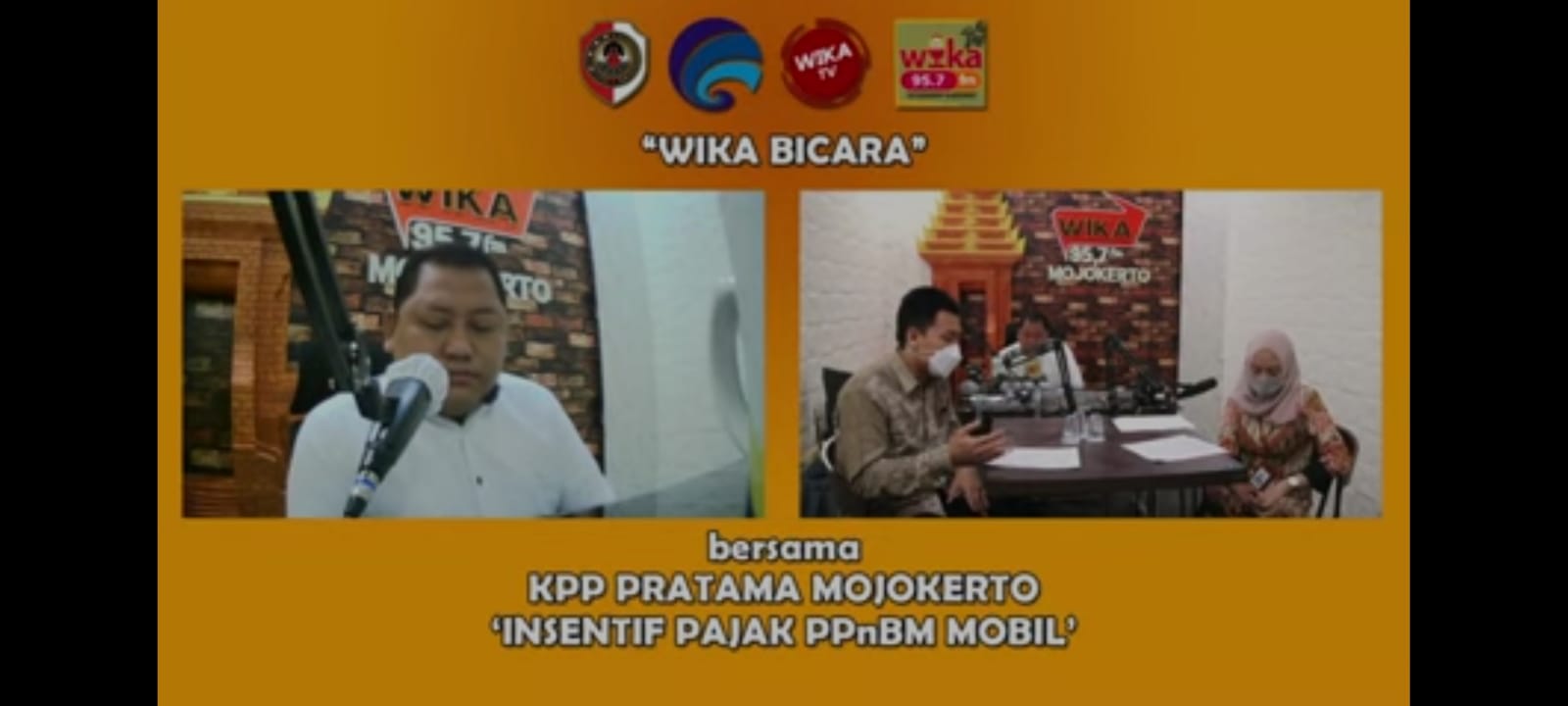 Dua Penyuluh Pajak Kantor Pelayanan Pajak (KPP) Pratama Mojokerto Wulan Nur Andari Kusumawati dan Abda Alif Yakfiy melakukan sosialisasi terkait ketentuan mengenai relaksasi PPnBM mobil sesuai Peraturan Menteri Keuangan Nomor 31/PMK.010/2021 di Radio Wika FM, Mojokerto (Selasa, 7/9).