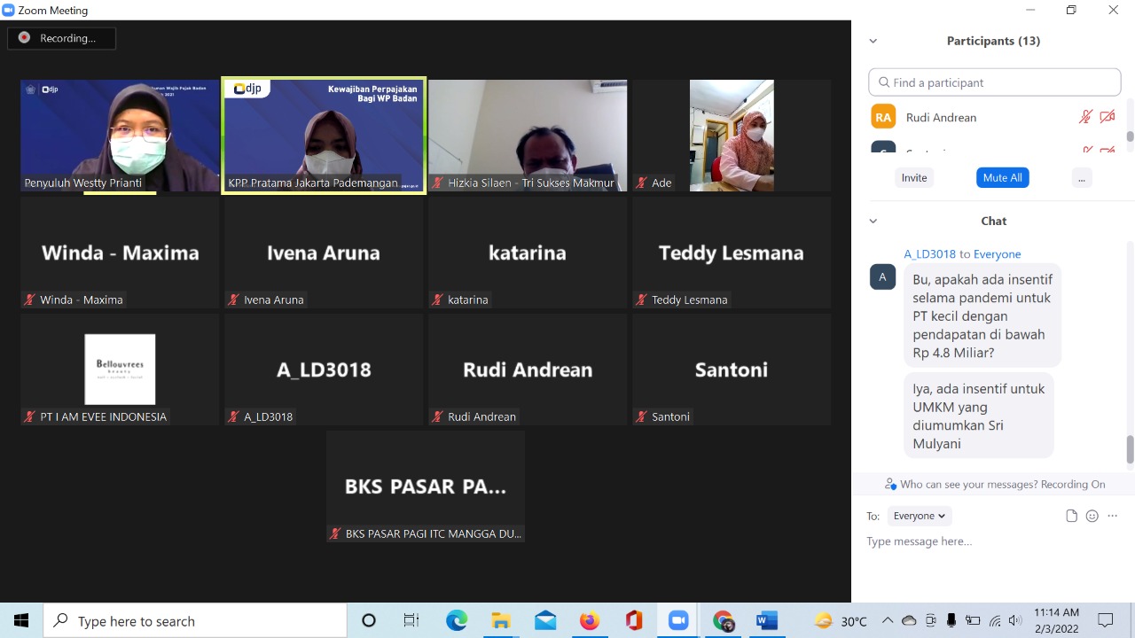 Kegiatan diselenggarakan secara daring melalui kanal Zoom Meeting dari ruang Fungsional Penyuluh Pajak KPP Pratama Jakarta Pademangan. Kelas pajak diselenggarakan untuk mengedukasi Wajib Pajak Badan dalam melakukan kewajiban perpajakan pelaporan SPT Tahunan Badan.