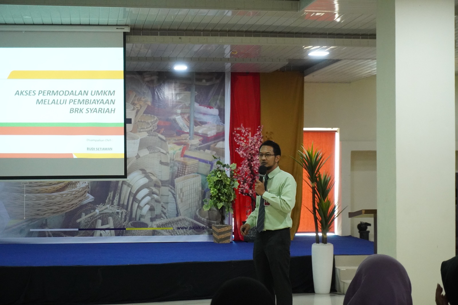 Kegiatan yang berlangsung di Aula KPP Pratama Pangkalan Kerinci ini juga menghadirkan narasumber dari Bank Riau Kepri Syariah, yaitu Budi Setiawan selaku Team Leader Pembiayaan.