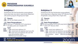 Christy menjelaskan terdapat dua kebijakan pada PPS yang akan disebut dengan Kebijakan I (satu) dan Kebijakan II (dua). Kebijakan I ditujukan kepada Wajib Pajak peserta Tax Amnesty (TA) yang belum mengungkap seluruh hartanya saat mengikuti TA, sedangkan Kebijakan II ditujukan kepada Wajib Pajak Orang Pribadi yang memiliki harta perolehan tahun 2016 hingga 2020 dan belum sepenuhnya dilaporkan pada Surat Pemberitahuan (SPT) Tahunan Orang Pribadi tahun pajak 2020.