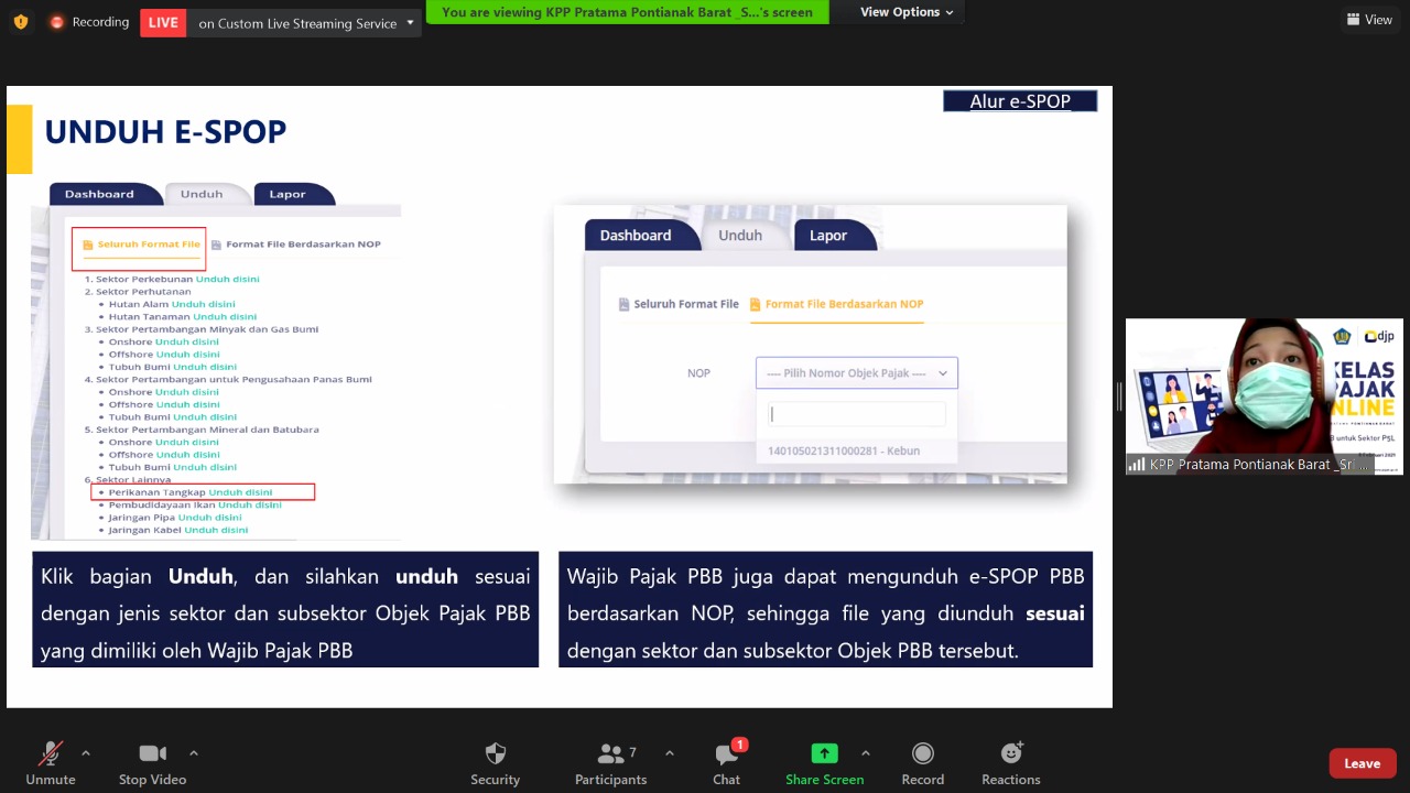 Kantor Pelayanan Pajak (KPP) Pratama Pontianak Barat mengadakan kelas pajak daring dengan tema Penyampaian dan Pengembalian Surat Pemberitahuan Objek Pajak (SPOP) PBB Sektor P5L secara Elektronik di ruang multimedia KPP Pratama Pontianak Barat (Senin, 8/2).
