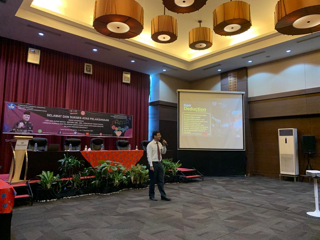 Kantor Pelayanan Pajak (KPP) Pratama Bengkulu Dua menjadi narasumber pada kegiatan Rapat Koordinasi Kemitraan (Link and Super Match) antara Balai Pengembangan Penjamin Mutu Pendidikan Vokasi Bidang Bangunan dan Listrik (BBPPMPV BBL), Sekolah Menegah Kejuruan (SMK), Perguruan Tinggi Vokasi, Lembaga Kursus dan Pelatihan serta Dunia Usaha dan Dunia Industri Wilayah Provinsi Bengkulu di Hotel Santika, Kota Bengkulu (Senin, 6/12).