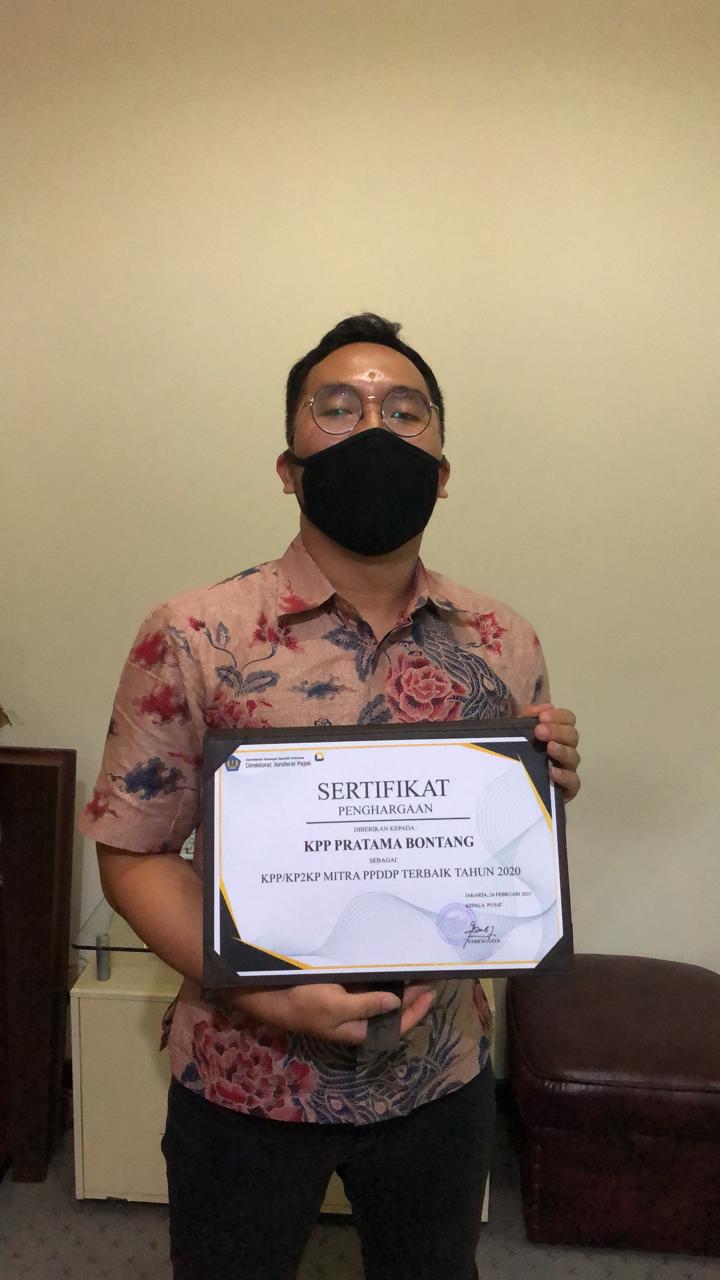 Menjadi mitra Pusat Pengolahan Data dan Dokumen Perpajakan (PPDDP) Terbaik tahun 2020, Kantor Pelayanan Pajak (KPP) Pratama Bontang menerima penghargaan langsung oleh Kepala PPDDP Samon Jaya pada Forum Group Discussion (FGD) Pengemasan Surat Pemberitahuan (SPT) dan Dokumen selain SPT secara daring (Kamis, 25/2).