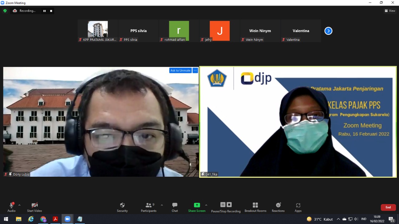 Kantor Pelayanan Pajak (KPP) Pratama Jakarta Penjaringan menyelenggarakan kelas pajak Program Pengungkapan Sukarela (PPS) melalui aplikasi Zoom Meeting (Rabu, 16/2). Kegiatan dilakukan di lantai 4 ruangan Fungsional Penyuluh Pajak KPP Pratama Jakarta Penjaringan.