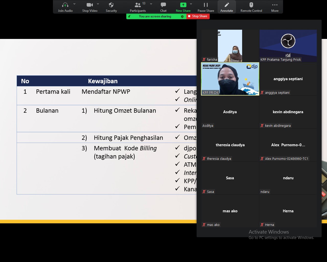 Kantor Pelayanan Pajak (KPP) Pratama Jakarta Tanjung Priok melaksanakan kelas pajak terkait pengisian SPT Tahunan Wajib Pajak Non Karyawan/UMKM (Usaha Mikro, Kecil dan Menengah) secara daring melalui aplikasi Zoom Meeting di Jakarta Utara (Kamis, 16/9).
