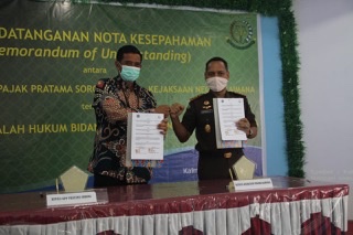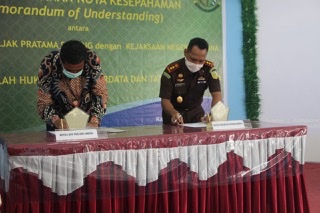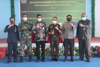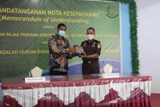 Kepala Kantor Pelayanan Pajak (KPP) Pratama Sorong Panca Kurniawan dan Kepala Kejaksaan Negeri (Kejari) Kaimana Trisno Margi Utomo menandatangani nota kesepahaman penegakan hukum di Rumah Makan Belia, Kabupaten Kaimana, Papua Barat (Selasa, 9/3).