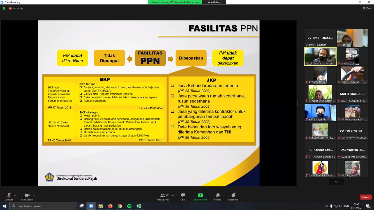 Kantor Pelayanan Pajak (KPP) Pratama Samarinda Ilir mengadakan kelas pajak dengan tema "Kewajiban Pengusaha Kena Pajak (PKP)" bagi wajib pajak yang sudah kukuhkan sebagai PKP secara daring di Kota Samarinda (Kamis, 4/11).