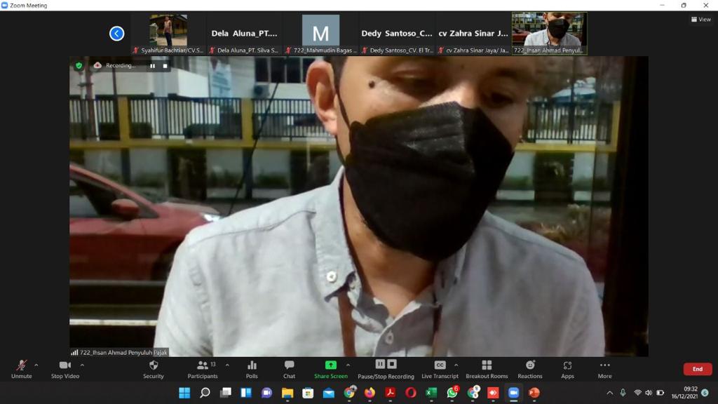 Kantor Pelayanan Pajak (KPP) Pratama Samarinda Ilir menyelenggarakan kelas pajak dengan tema Sosialisasi Kewajiban Perpajakan bagi Pengusaha Kena Pajak (PKP) baru melalui Zoom Meetings di Kota Samarinda (Kamis, 16/12). Muhammad Ihsan Ahmad, Mahmudin Bagas, Chantya Karmila selaku pegawai KPP Pratama Samarinda Ilir menjadi narasumber dalam kelas pajak ini.