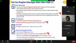Kantor Pelayanan Pajak (KPP) Pratama Semarang Candisari menyelenggarakan sosialisasi Peraturan Direktur Jenderak Pajak Nomor PER-03 Tahun 2022 tentang Faktur Pajak dan Peraturan Pemerintah Nomor 9 Tahun 2022 tentang Jasa Konstruksi bagi Wajib Pajak Badan Pengusaha Kena Pajak (PKP) melalui aplikasi Zoom Meeting di Semarang (Selasa, 2/4).