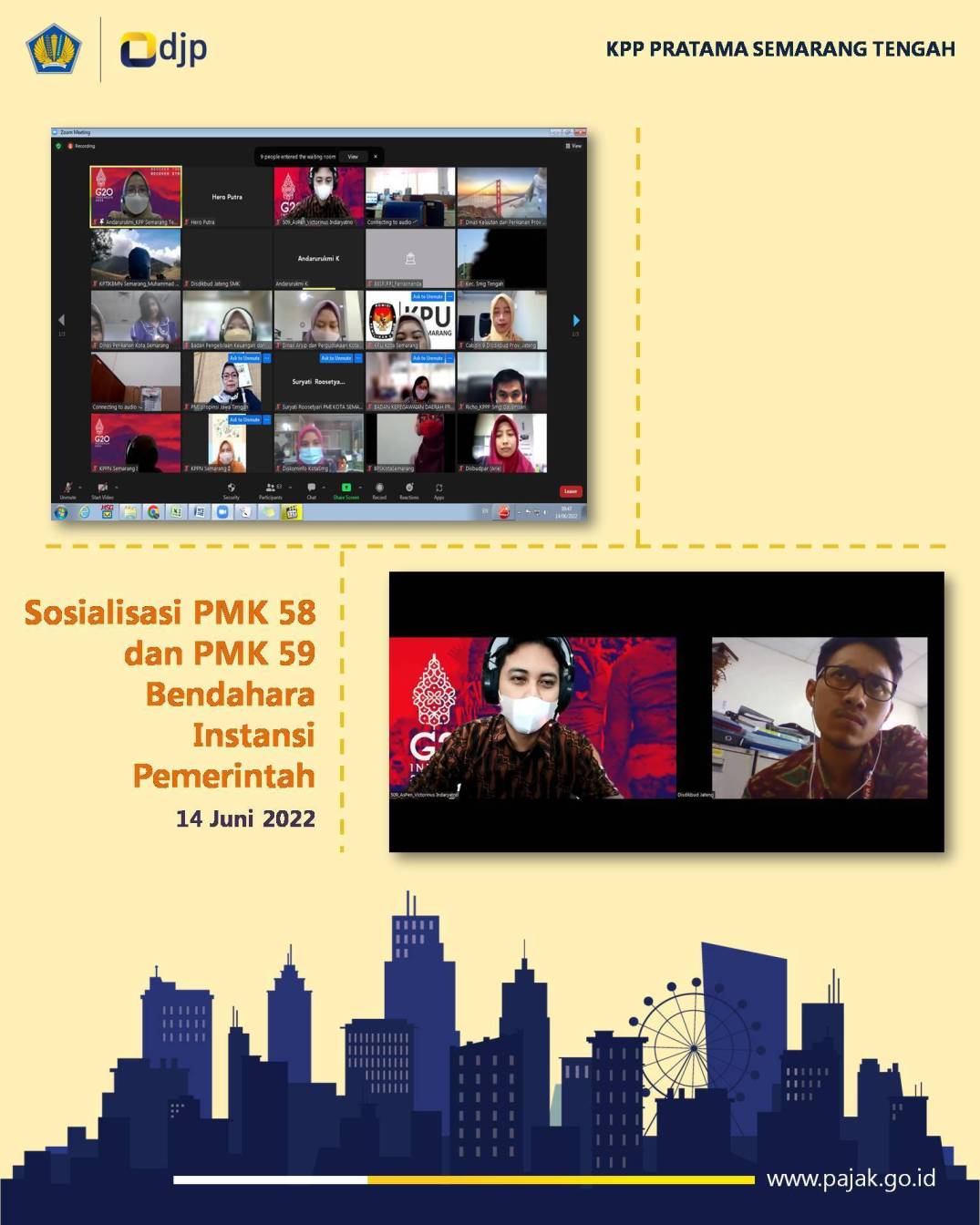 Kantor Pelayanan Pajak (KPP) Pratama Semarang Tengah mengadakan sosialisasi yang membahas mengenai Peraturan Menteri Keuangan (PMK) Nomor 58/PMK.03/2022 dan PMK Nomor 59/PMK.03/2022 secara daring di Semarang (Selasa,14/6). Kegiatan berlangsung selama dua jam sejak pukul 09.30 WIB. Kegiatan ini dihadiri oleh 60 Bendahara Instansi Pemerintah di lingkungan KPP Pratama Semarang Tengah dengan narasumber penyuluh dari KPP Pratama Semarang Tengah yaitu Victorinus Indaryatno.