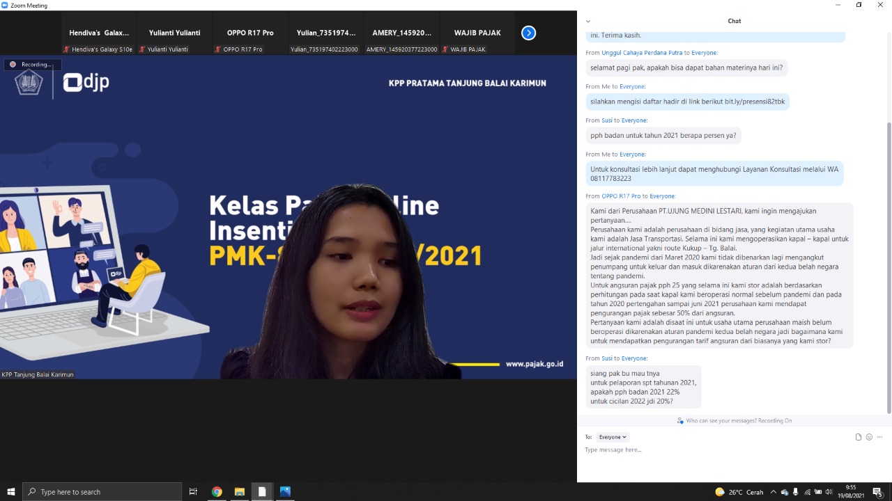 Kantor Pelayanan Pajak (KPP) Pratama Tanjung Balai Karimun (TBK) menggelar kegiatan kelas pajak yang dilaksanakan secara daring terkait pemanfaatan insentif pajak untuk wajib pajak terdampak pandemi Covid-19 sesuai dengan Peraturan Menteri Keuangan (PMK) Nomor: PMK‑82/PMK.03/2021 perubahan atas PMK-9/PMK.03/2021 di Karimun, Kepulauan Riau (Senin, 16/8).
