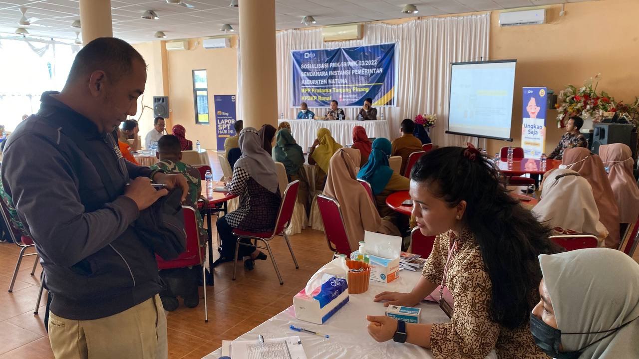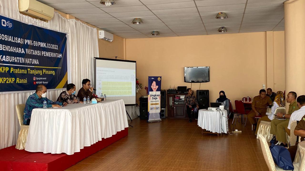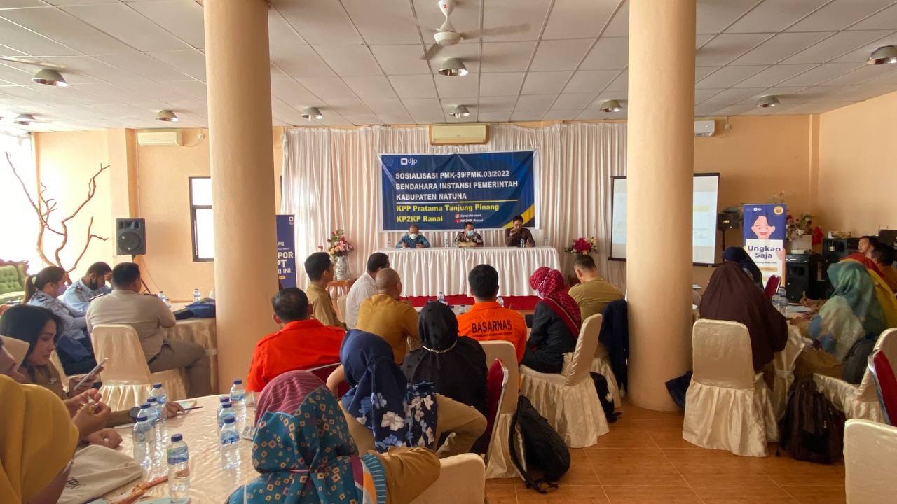 Kantor Pelayanan Pajak (KPP) Pratama Tanjung Pinang menyelenggarakan sosialisasi Peraturan Menteri Keuangan (PMK) Nomor 59/PMK.03/2022 (PMK-59) kepada puluhan Bendahara Instansi Pemerintah di Ranai, Natuna, Kepulauan Riau (Selasa, 31/5). PMK-59 adalah aturan terbaru yang mengatur tentang Pemotongan dan/atau Pemungutan, Penyetoran, dan Pelaporan Pajak bagi Instansi Pemerintah.