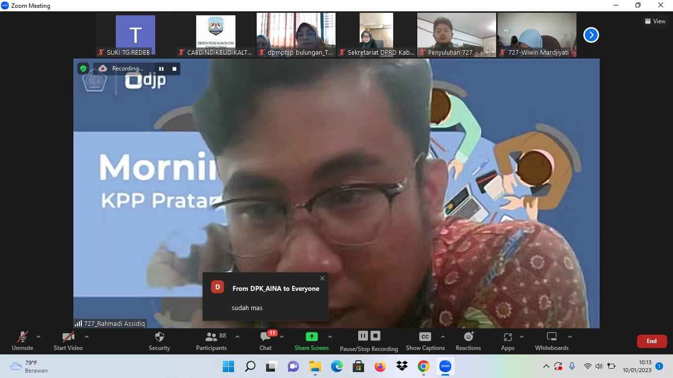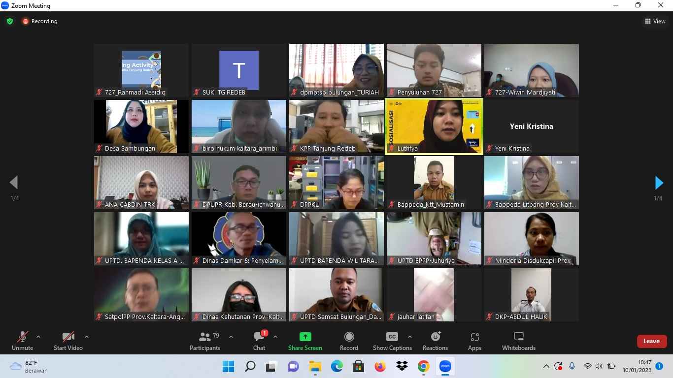 Kantor Pelayanan Pajak (KPP) Pratama Tanjung Redeb melaksanakan edukasi perpajakan kepada seluruh instansi pemerintahan di seluruh wilayah kerja KPP Tanjung Redeb secara daring melalui aplikasi Zoom Meeting di Kota Tarakan (Selasa, 10/1).